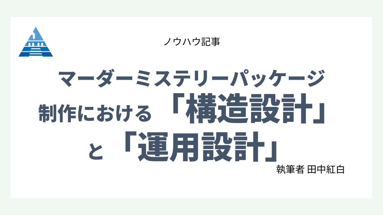 マーダーミステリーパッケージ制作における「構造設計」と「運用設計」(田中紅白) 2026 3/04 note記事 パッケージ 2026年3月4日 このコンテンツはパスワードで保護されています。閲覧するには以下にパスワードを入力してください。パスワードは会員専用Discordに記載します。パスワードは半期毎に変更されます。 パスワード note記事 パッケージ 関連記事 マダミスにおける投票~9つの効用と7つの弊害(ちゃな) 2026年3月4日 マーダーミステリーは犯人に投票することを目標とすべきか?(える) 2026年2月18日 マーダーミステリーの作成の失敗談(反転ライオン) 2026年2月18日 サンプラーアプリ『Koala Sampler』のマダミス公演用BGMアプリとしてのマニュアル、テクニック(りゅぁ) 2026年1月7日 多ジャンル創作の勧め(藤野友祐) 2026年1月7日 採録『店舗・メーカーに伺う』第7回(秋山真琴) 2025年12月2日 マダミス作家が語る、オンラインマダミス四方山話(りにょり) 2025年12月2日 我々の生存戦略と、そのためのブランドの作り方の共有(kentaro(newmerous)) 2025年11月10日